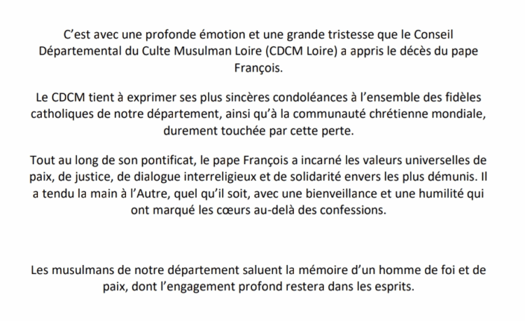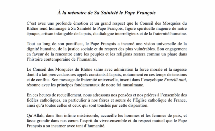 C’est avec une profonde émotion et un grand respect que le Conseil des Mosquées du Rhône rend hommage à Sa Sainteté le Pape François, figure spirituelle majeure de notre époque, artisan infatigable de la paix, du dialogue interreligieux et de la fraternité humaine....