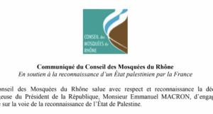 Le Conseil des Mosquées du Rhône salue avec respect et reconnaissance la décision courageuse du Président de la République, Monsieur Emmanuel MACRON, d’engager la France sur la voie de la reconnaissance de l’État de Palestine.